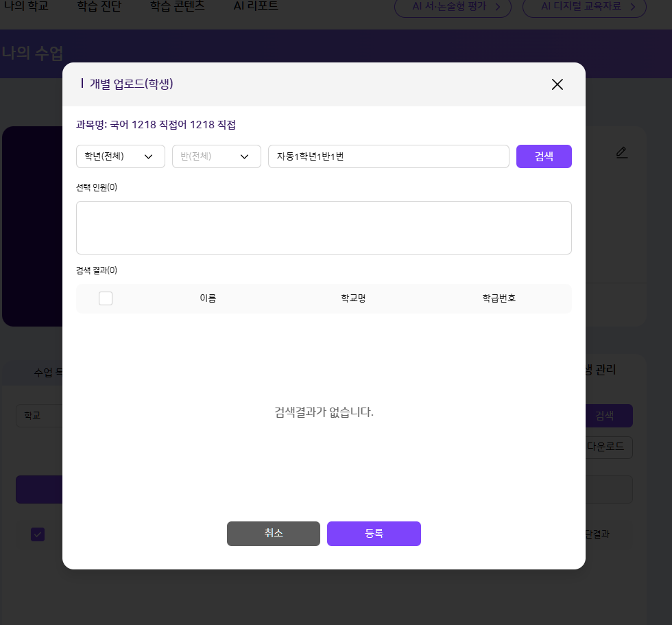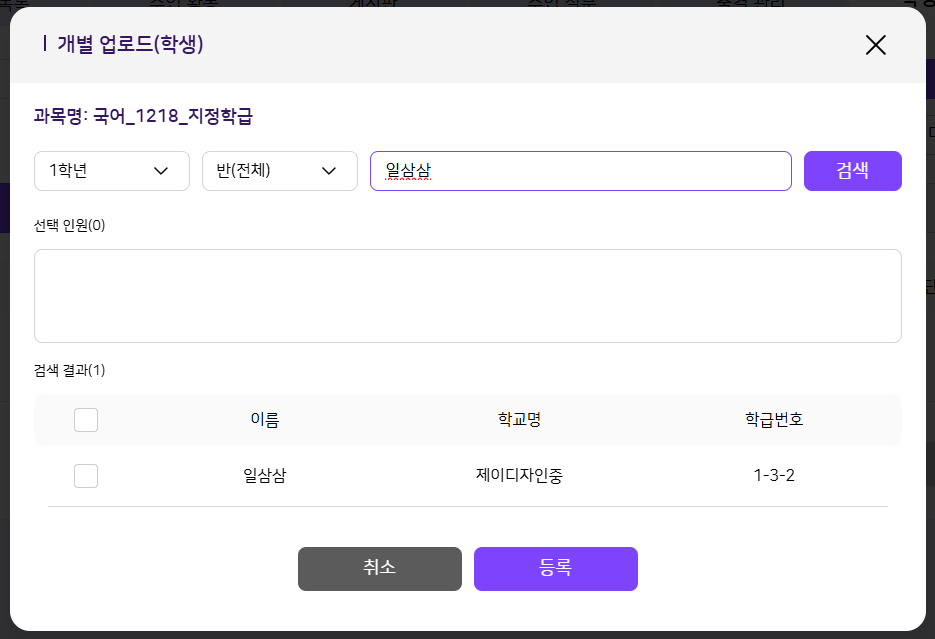 | Description | [검색][FO] 나의 수업 > 과목 상세 > 학생 관리 > 학생탭 > 개별 업로드 > 검색 1. 부분 검색 : 동일 2. 전체 검색 : 동일 | ||||