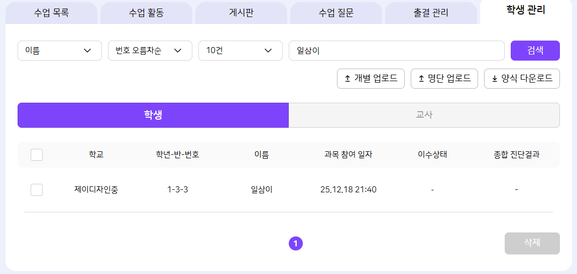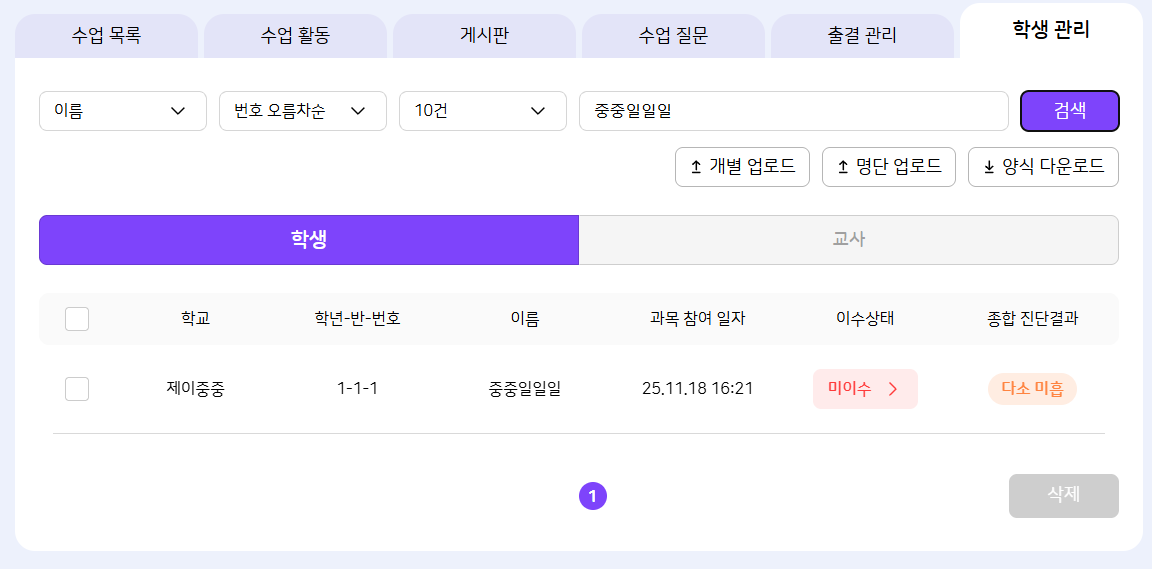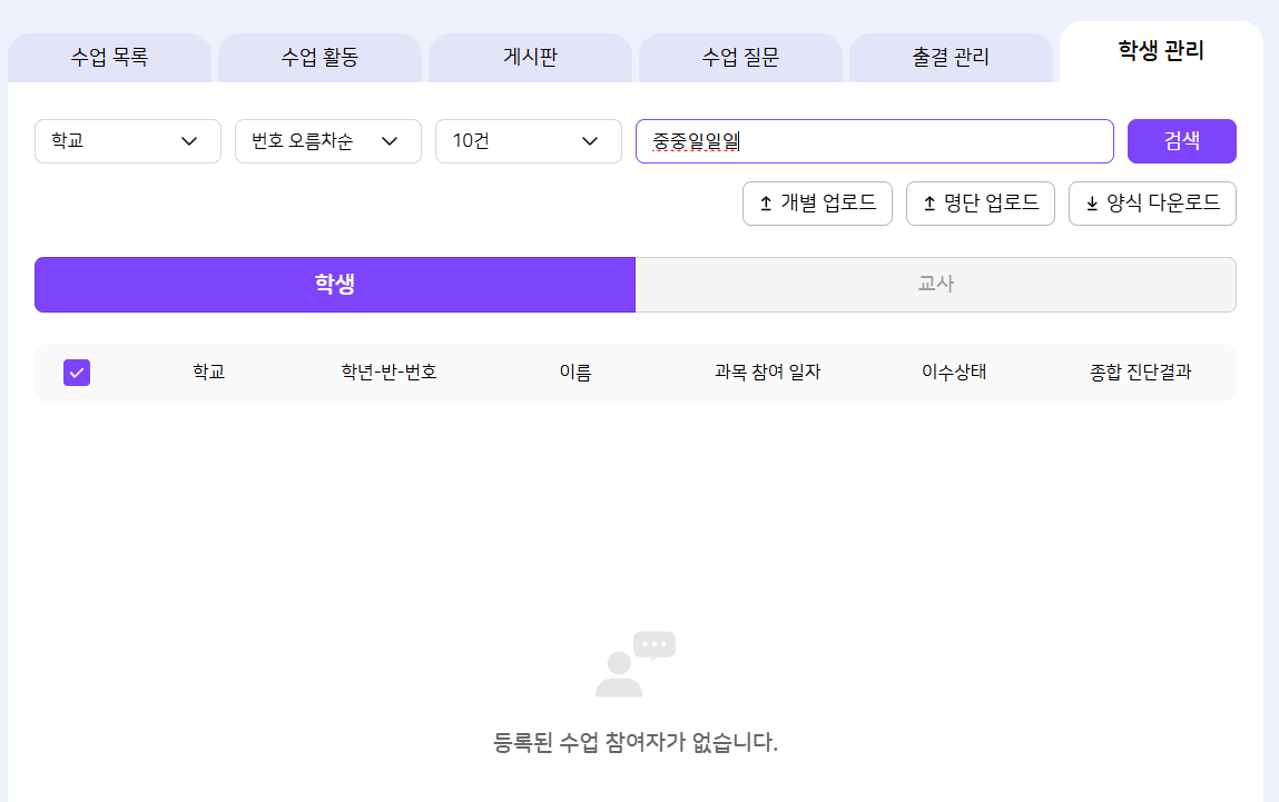 | Description | [검색][FO] 나의 수업 > 과목 상세 > 학생 관리 > 학생 목록 검색 1. 부분 검색 : 검색 안됨 2. 전체 검색 : 검색 안됨 | ||||