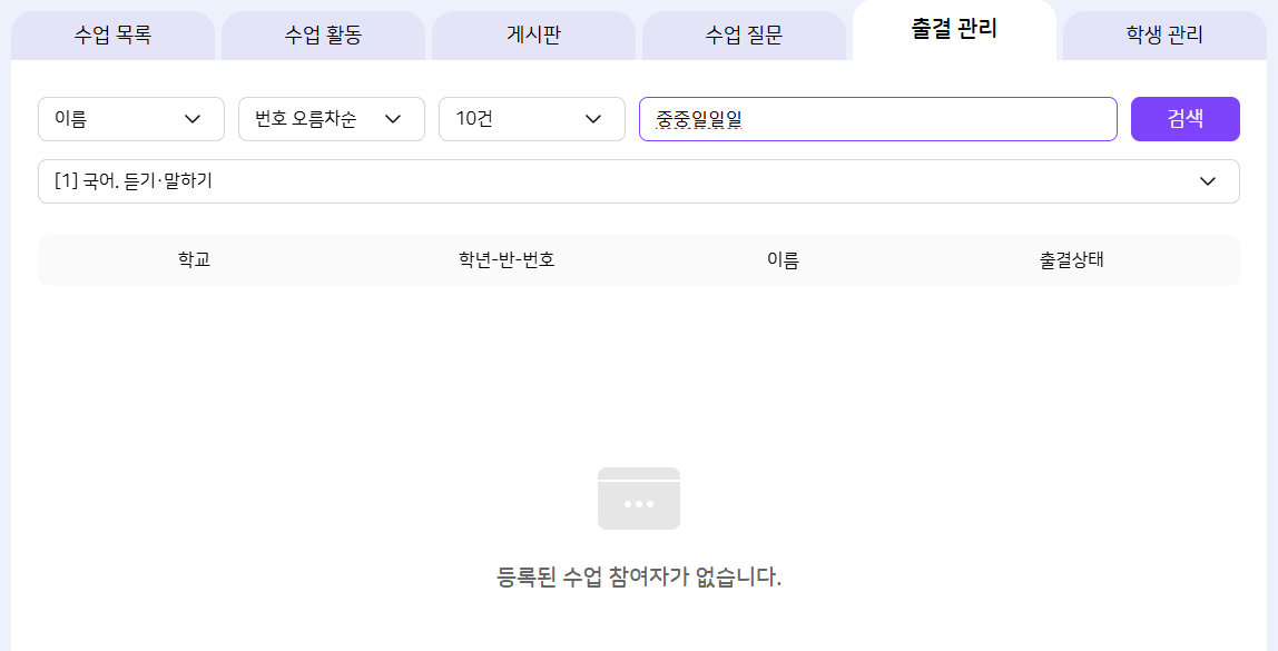 | Summary | 0001855: [검색][FO] 나의 수업 > 과목 상세 > 출결관리 > 학생 목록 검색 | ||||