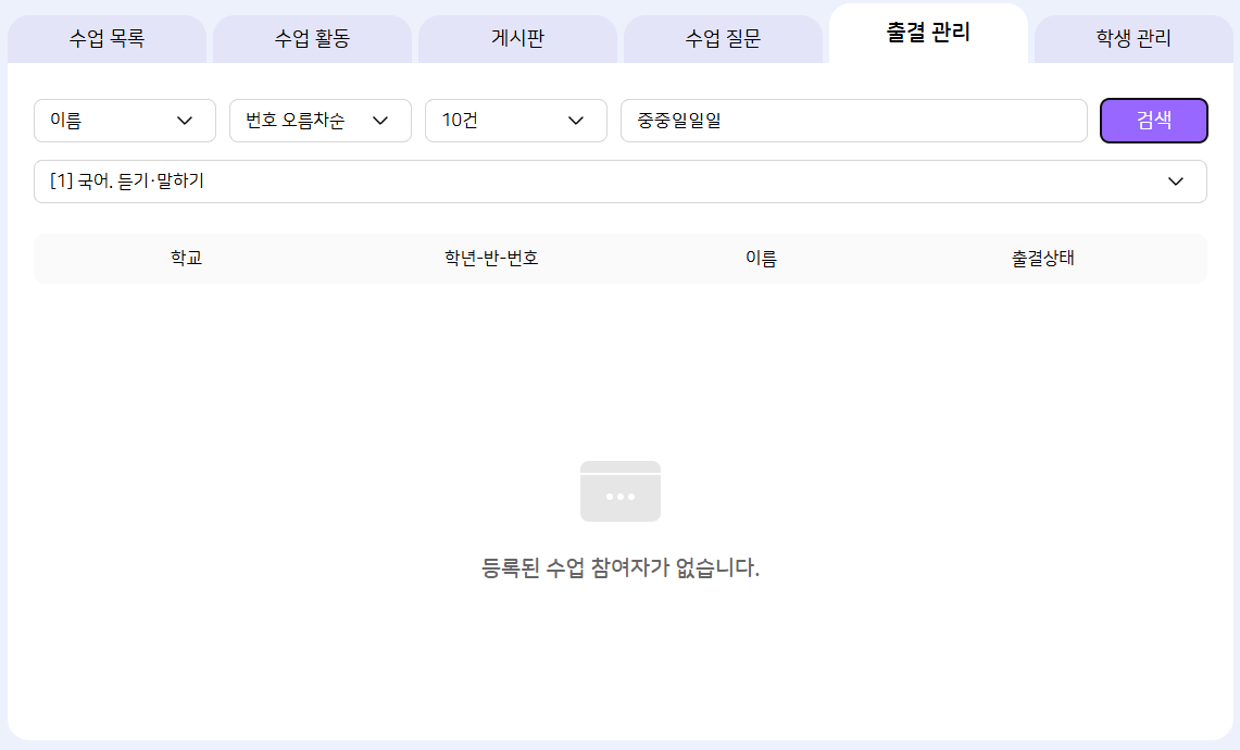 | Description | [검색][FO] 나의 수업 > 과목 상세 > 출결관리 > 학생 목록 검색 1. 부분 검색 : 검색 안됨 2. 전체 검색 : 검색 안됨 | ||||