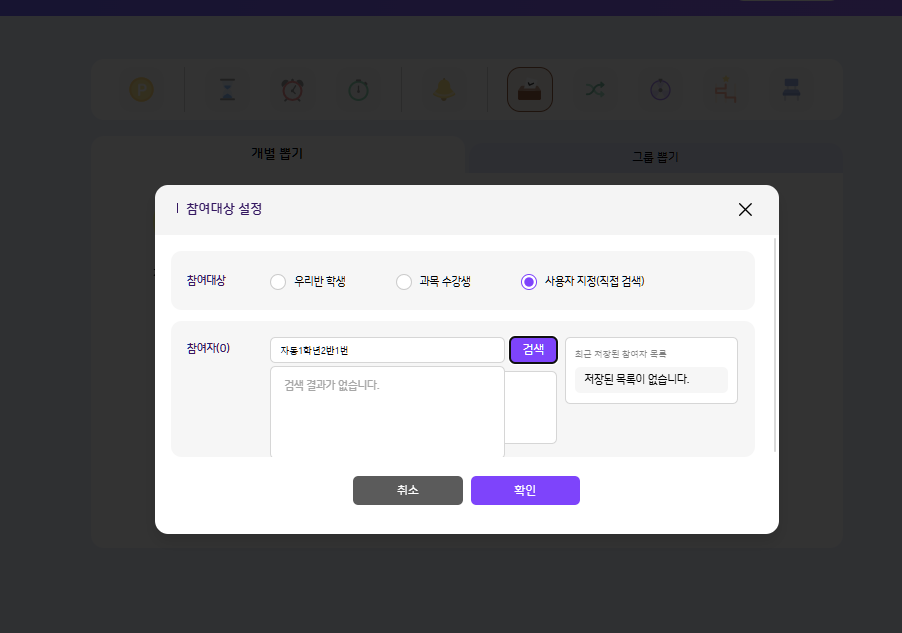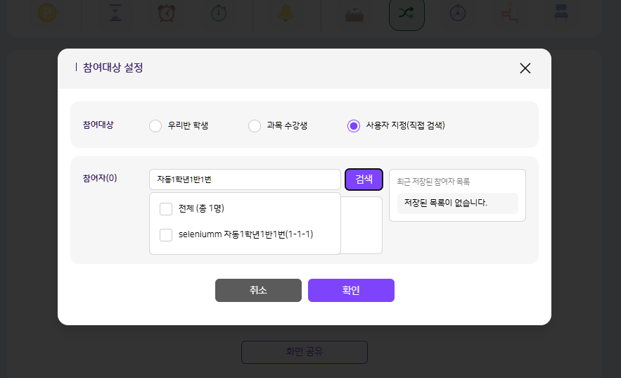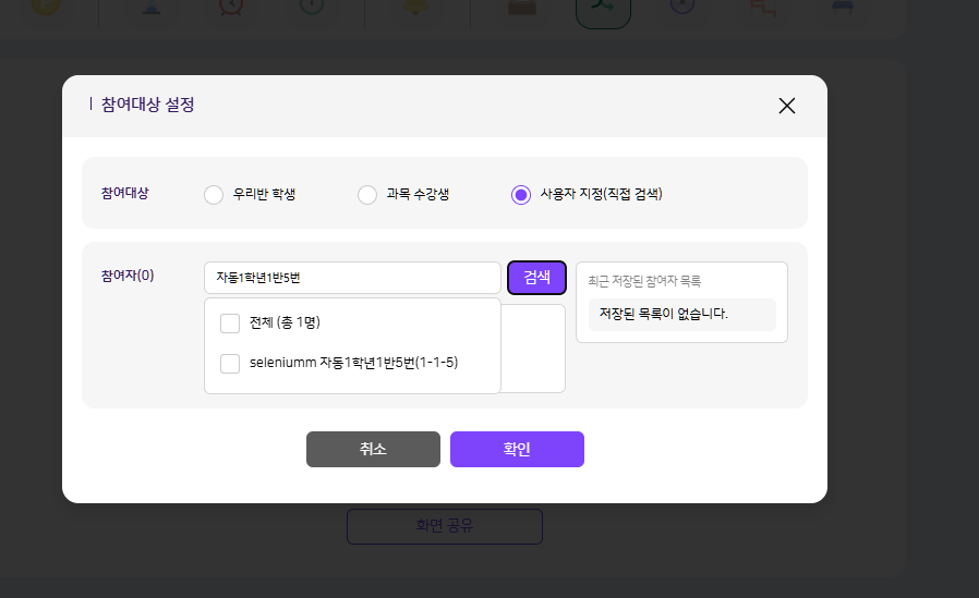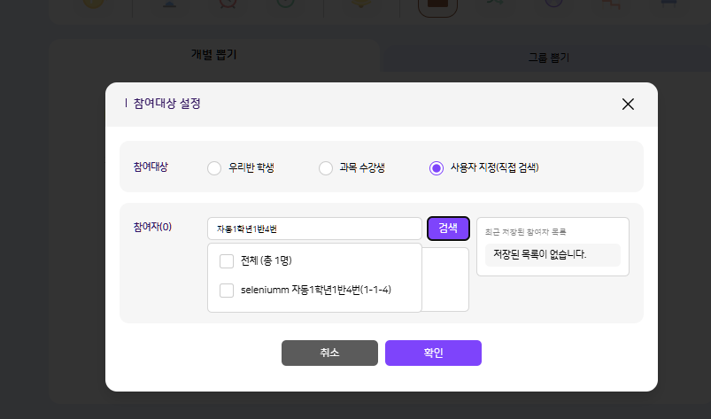 | Description | [검색][FO] 학급경영도구 > 참여대상 설정 > 사용자 지정(직접 검색) > 검색 1. 부분 검색 : 동일 2. 전체 검색 : 동일 | ||||