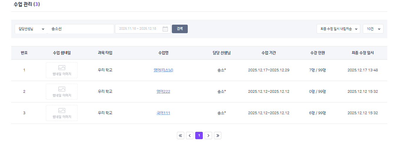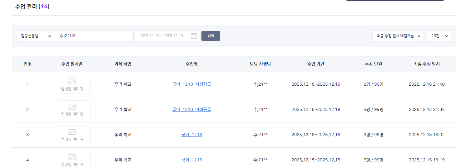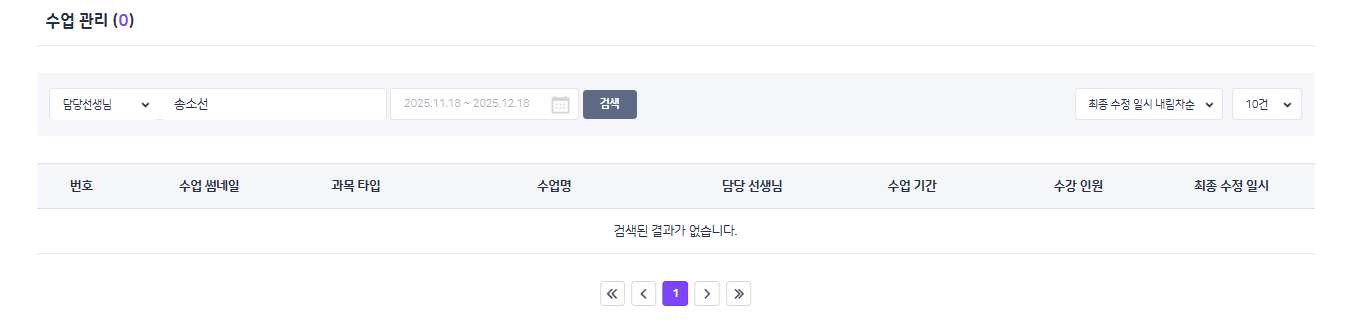 | Description | 나의 수업 관리 > 수업 관리 > 담당선생님 검색 1. 부분 검색 : 안됨 2. 전체 검색 : 안됨 | ||||