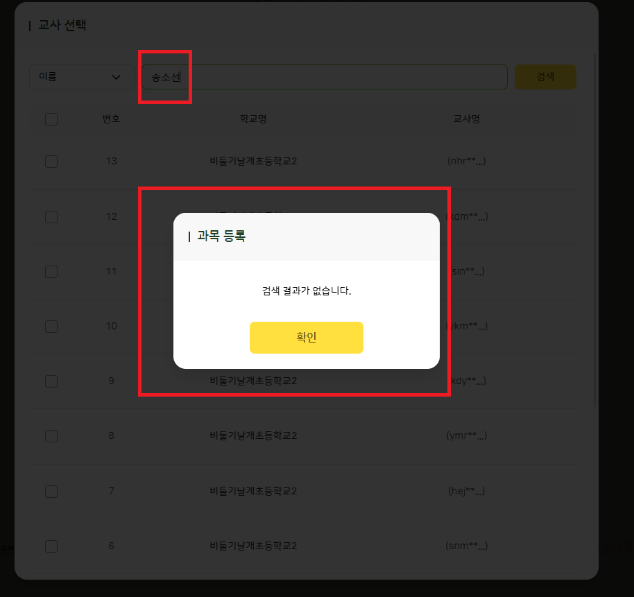 | Steps To Reproduce | 나의 학교 > 나의 수업 > 과목 수정 > 과목 사용 권한 설정 > 교사 선택 > 이름 검색 | ||||