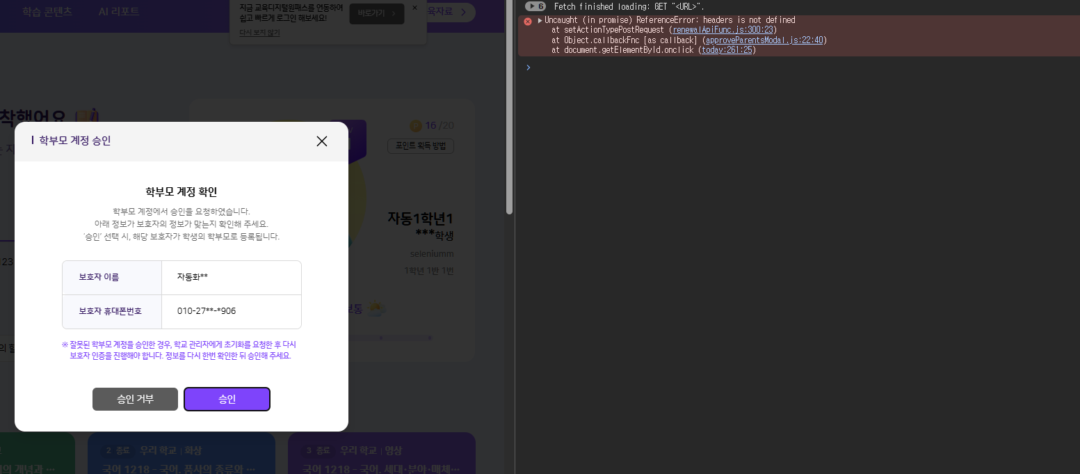 | Steps To Reproduce | 1. 학부모 계정 가입 신청 2. 학생 계정 로그인 3. 학부모 계정 승인 팝업에서 승인 버튼 클릭 | ||||