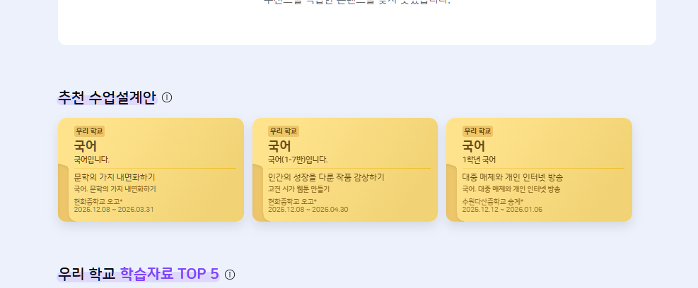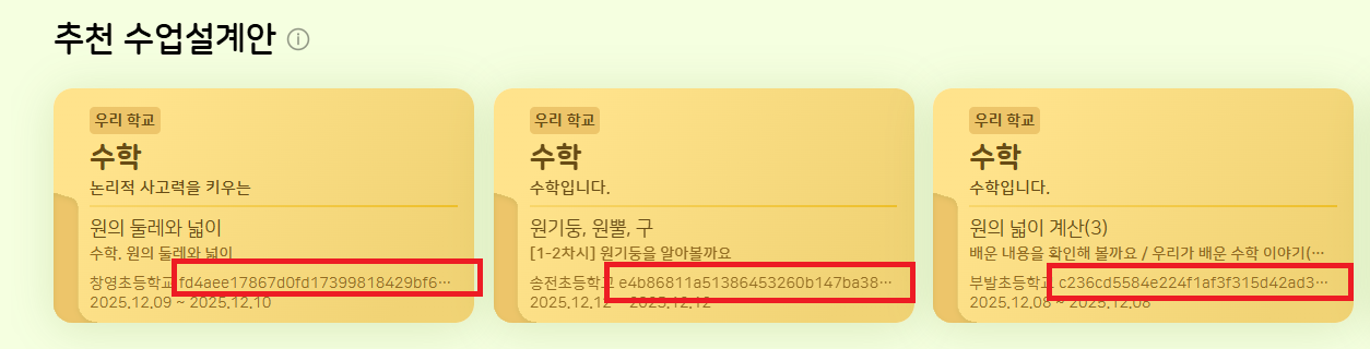 | Description | [암호화][FO] 교사 : 학습 콘텐츠 > 추천 콘텐츠 > 추천 수업설계안 > 교사명 | ||||