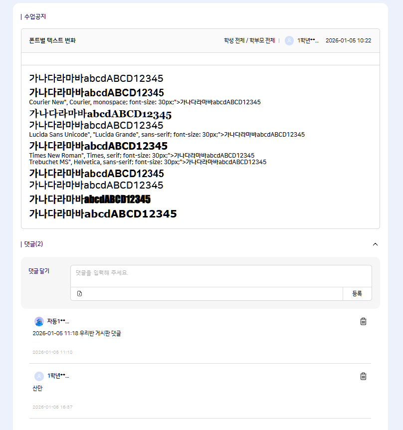 | Description | [마스킹][교사] 나의 학교 > 우리반 게시판 - 게시글 작성자, 댓글 | ||||