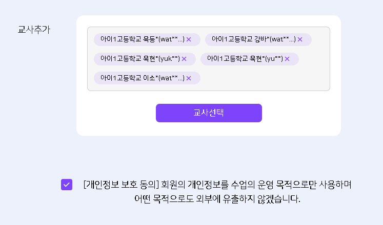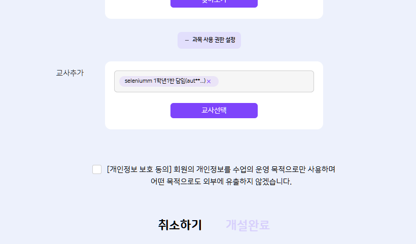 | Description | [마스킹][교사] 나의 학교 > 나의 교실 > 과목 개설 - 과목 권한 추가 (교사 추가) | ||||