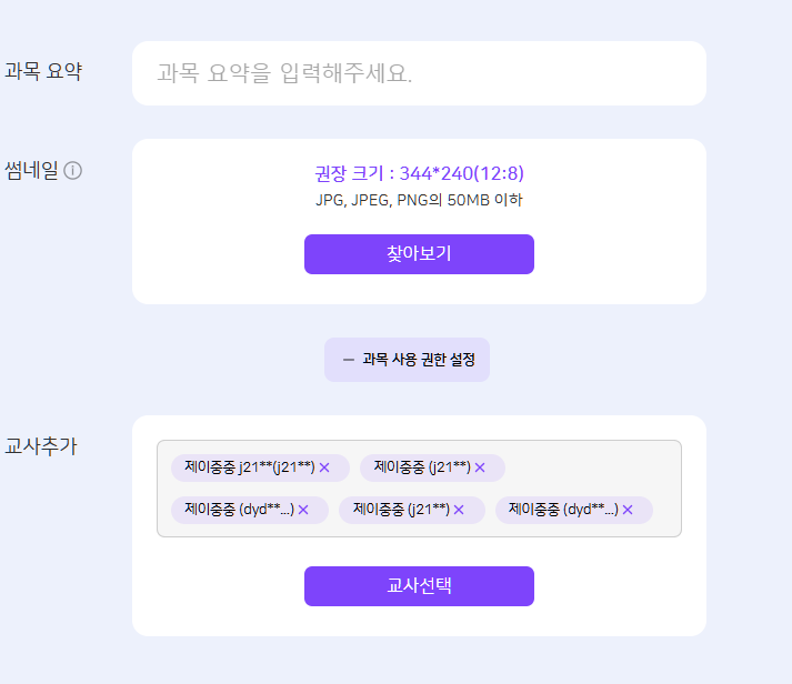 | Description | [마스킹][교사] 나의 학교 > 나의 교실 > 과목 개설 - 과목 권한 추가 (교사 추가) | ||||