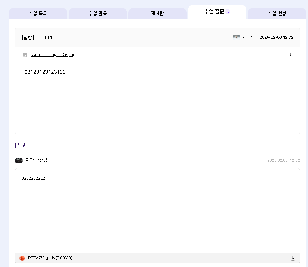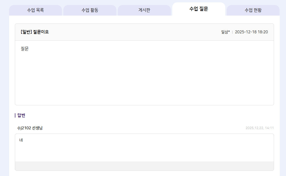 | Description | [마스킹][학생] 나의 수업 > 수업 카드 > 수업 질문 - 답변에 교사명 평문 노출 | ||||