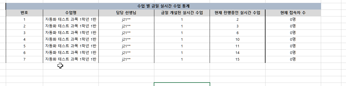 | Description | [마스킹][학교BO] 메인 대시보드 > 현재 진행중인 실시간 수업 현황 > 더보기 > 엑셀 다운로드 > 담당 선생님 | ||||