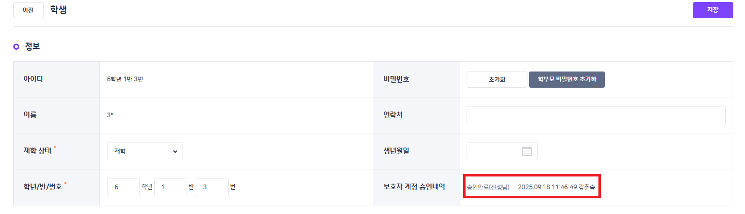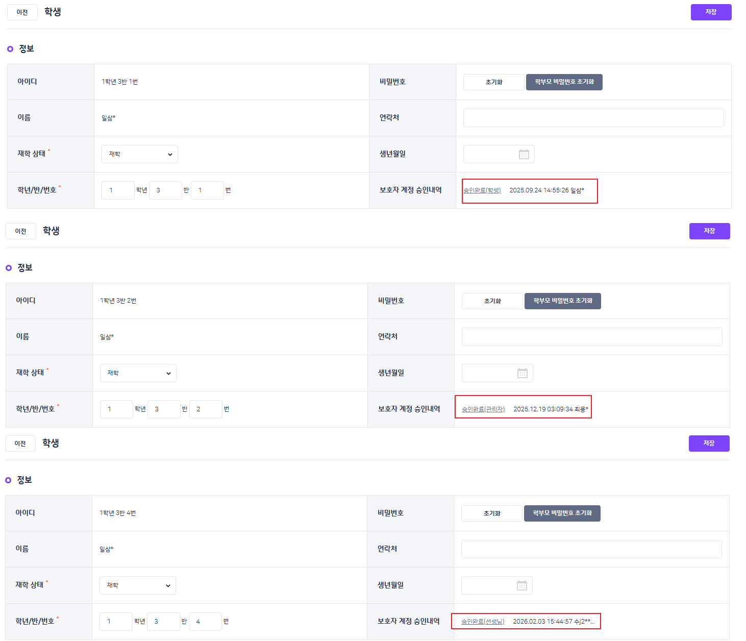 | Description | [마스킹][학교BO] 계정 관리 > 학생 > 학생 상세 > 보호자 계정 승인내역 | ||||