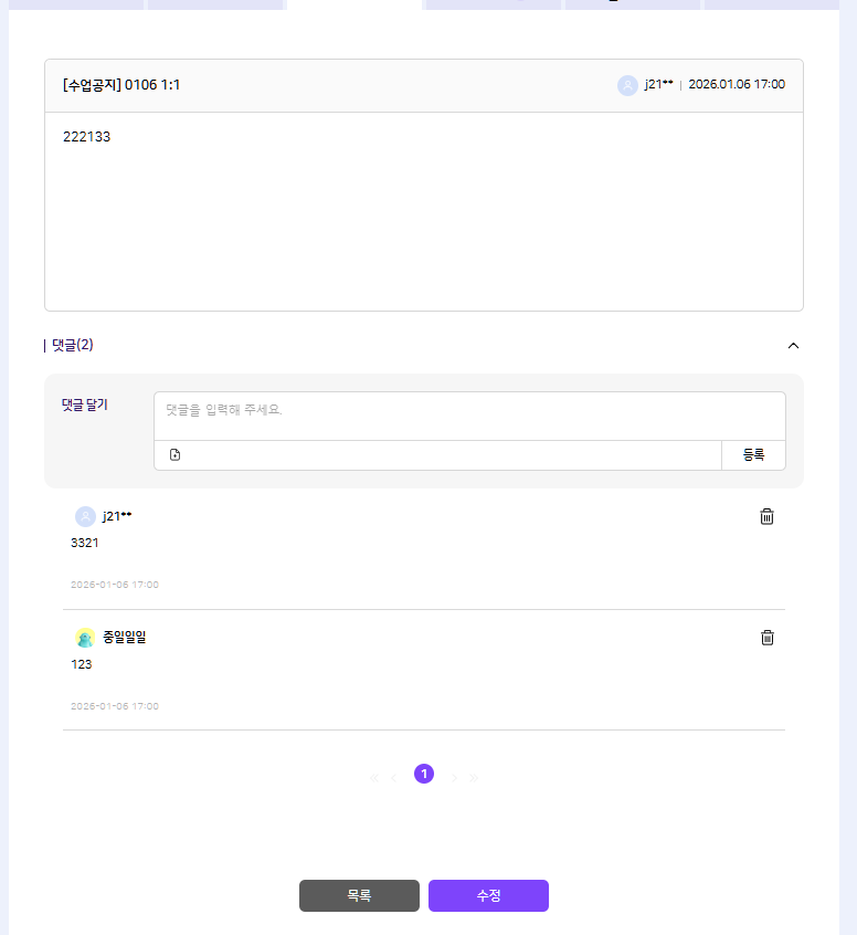 | Description | [마스킹][교사] 나의 학교 > 나의 교실 > 과목 상세 > 게시글 - 댓글 | ||||