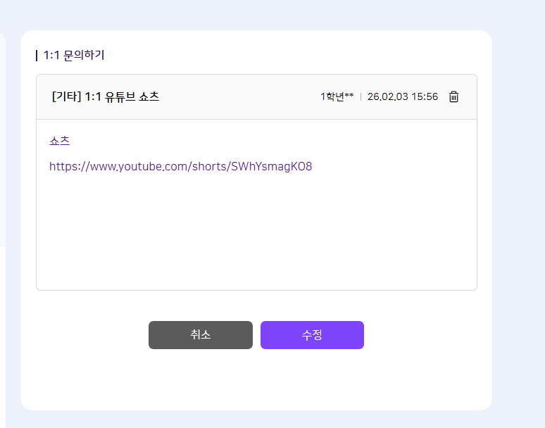 | Steps To Reproduce | 1. 교사/학생/학부모 로그인 2. 1:1 문의하기 > 유튜브 링크 등록 | ||||