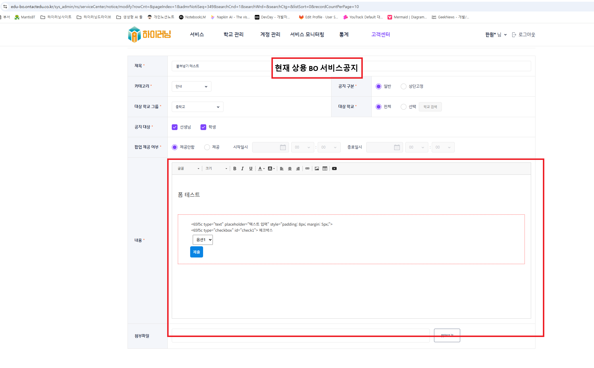 학교BO - html 미적용 확인했습니다. FO, 플랫폼BO 및 이슈 수정으로 인한 사이드 이슈의 경우 코멘트 히스토리로 추적하기가 어렵다고 판단하여 해당 이슈에 연관으로 걸어두겠습니다. |