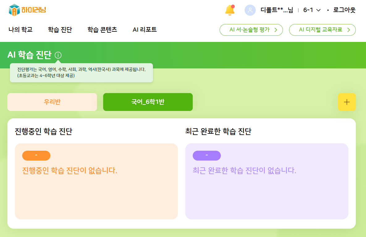 | Description | [디폴트][FO] AI 학습 진단을 생성할 수 없는 현상 *정상적인 6학년 국어 과목인데 "해당 과목은 학습 진단 서비스를 제공하지 않습니다." 라고 노출 | ||||