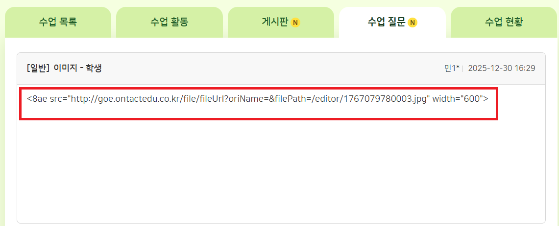 2026-01-05 02:51 이세희 Summary [에디터][FO] 학생 : 나의 수업 > 수업 질문 에서 에디터 기능 사용 후 등록 시 태그 노출되는 현상 => [에디터][FO] 학생 : 나의 수업 > 수업 질문 에서 에디터 이미지 등록 시 태그 노출되는 현상