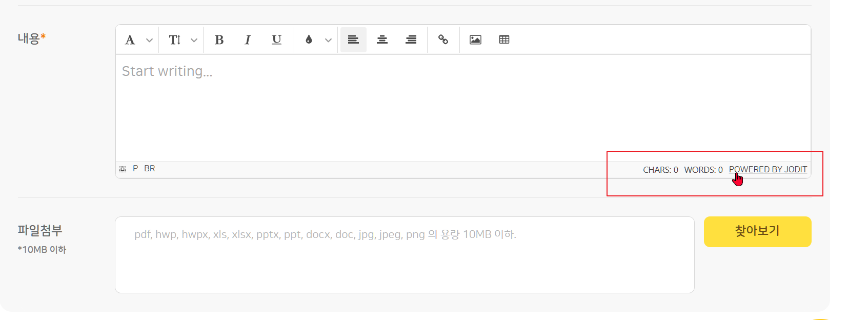 | Description | [에디터] 에디터 영역 우측 하단에 'POWERED BY JODIT' 링크 노출 여부 *해당 링크 노출이 의도인지 확인이 필요합니다. | ||||