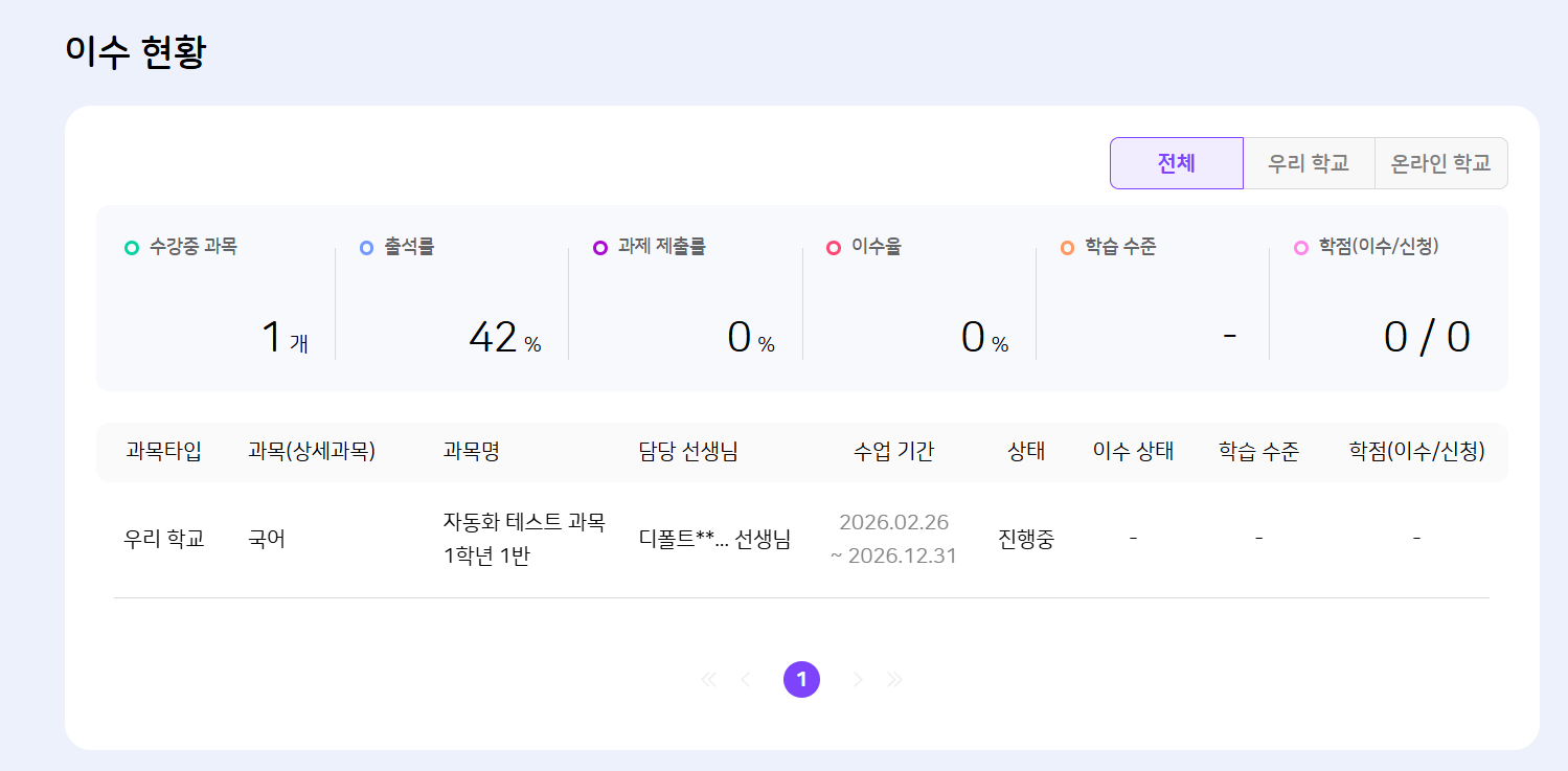 | Description | [디폴트] 학생 : 나의 교실 - 이수현황에 수강중인 과목/출석률/학점 표시 안되는 현상 데이터 없으면 0 or - 표기라도 되어야함. | ||||