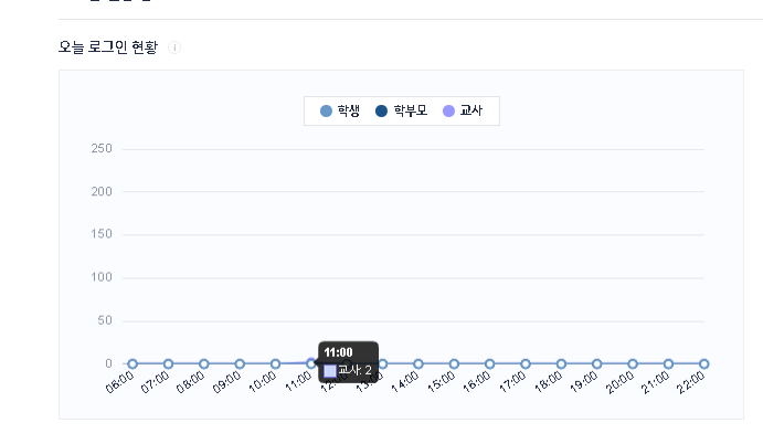 몇개의 계정으로 접속 했고 수업 생성도 했지만 일,주,월 필터 선택해도 데이터가 노출 되지 않음.