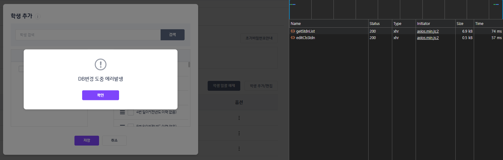 Description디폴트초등 1학년 2반에 배정되지 않은 임의의 학생 추가 시 'DB 변경 도중 에러 발생' 알림이 발생하는 현상입니다.