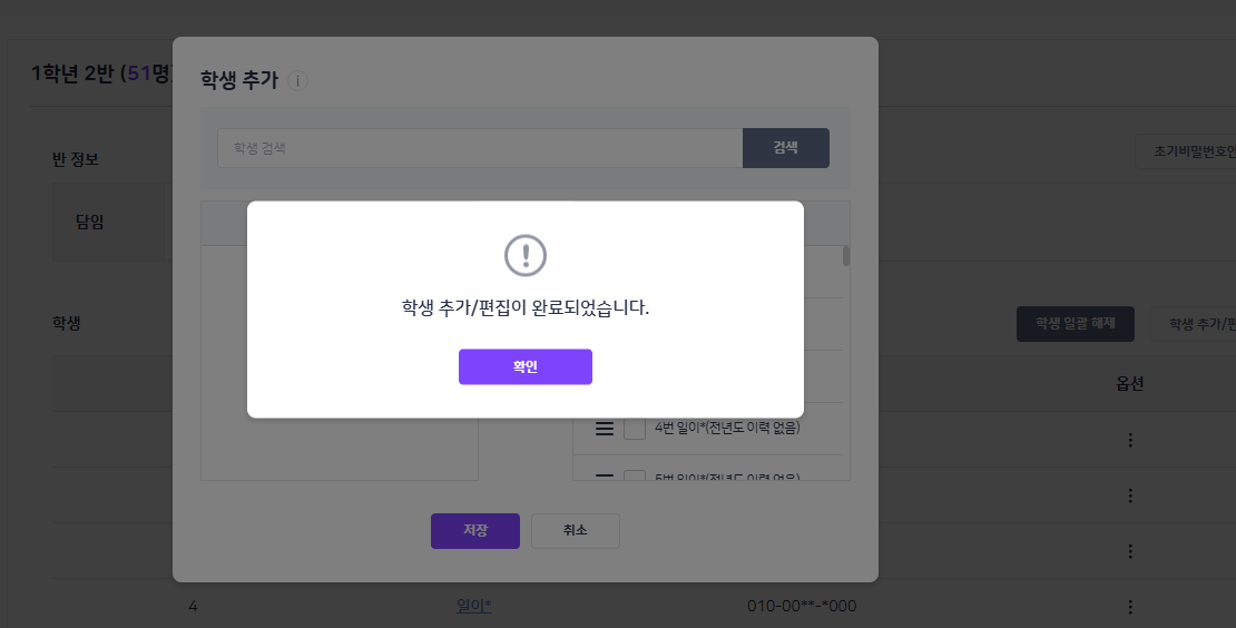 ※ 이슈 발생된 학생들을 1학년 1반에 추가 시 정상 추가됩니다.