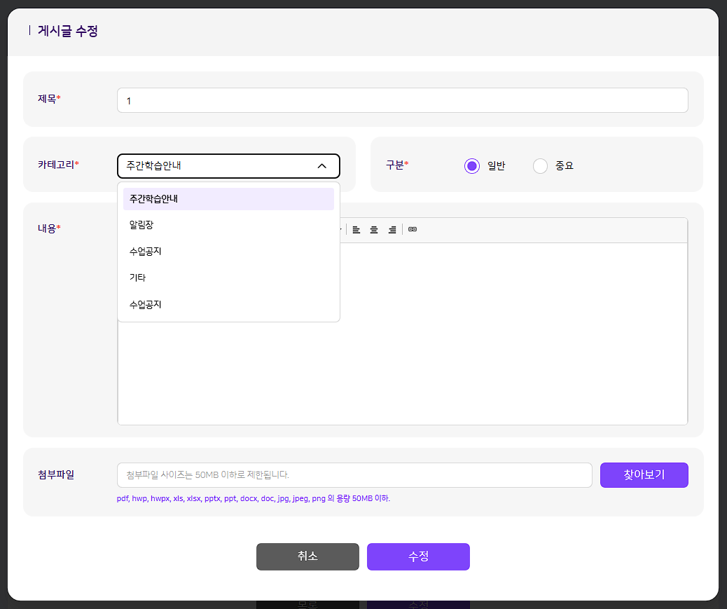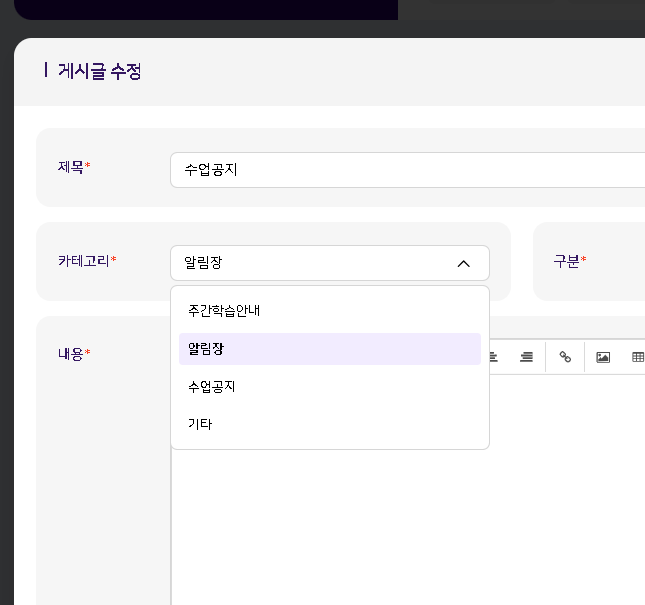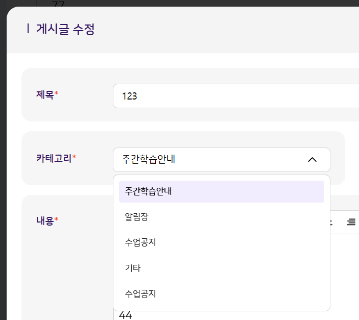 | Steps To Reproduce | 나의 학교 > 나의 수업 > 과목 상세 > 게시판 > 게시글 상세 > 수정 > 카테고리 클릭 | ||||