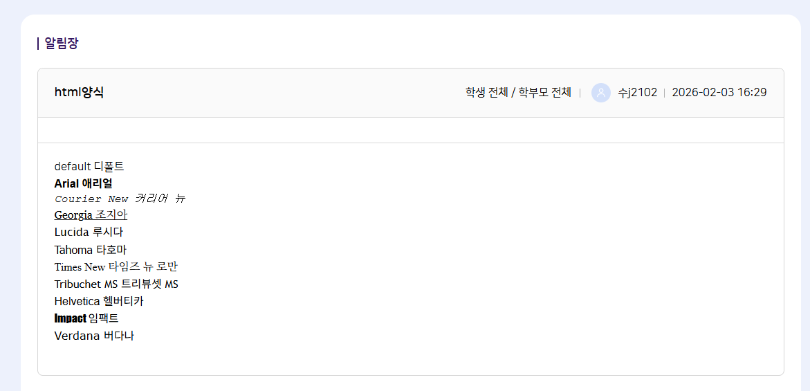 우리반 게시판에서 체크한 텍스트를 수업게시글에 복사한 결과 html양식을 실제로 가져오는것 같습니다. |