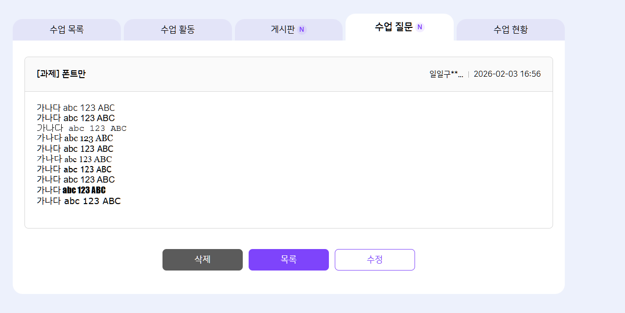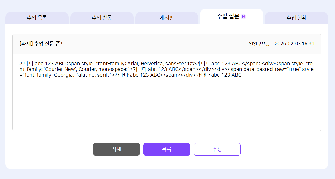 | 2026-01-05 03:30 | 이세희 | Summary | [에디터][FO]학생 > 수업 질문에서 에디터 내 특정 글꼴로 등록 시 태그 노출되는 현상 => [에디터][FO]학생 : 수업 질문에서 에디터 내 특정 글꼴로 등록 시 태그 노출되는 현상 |