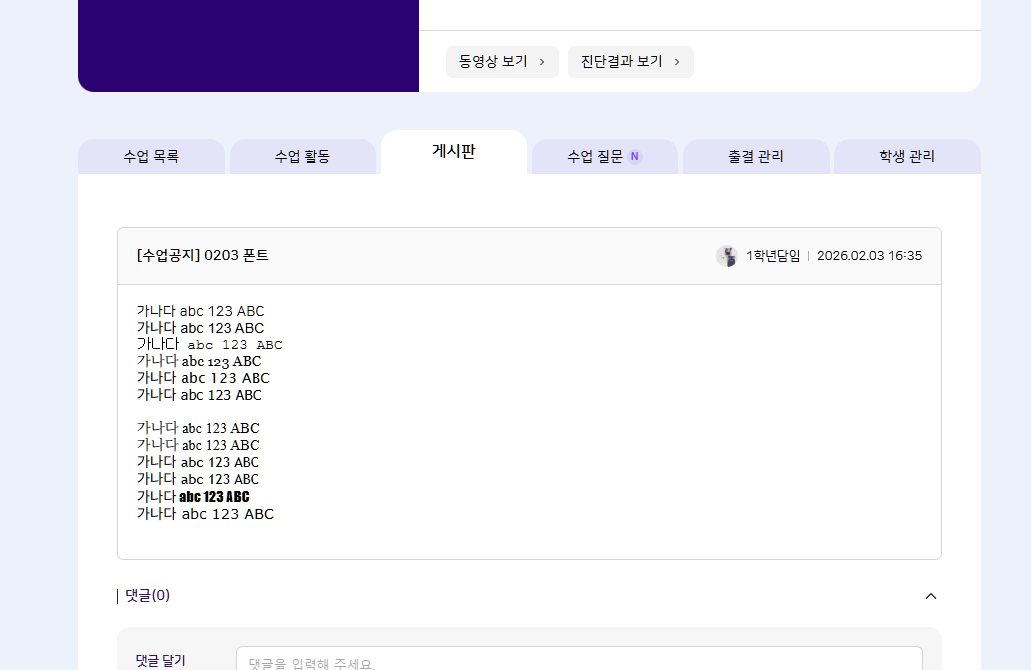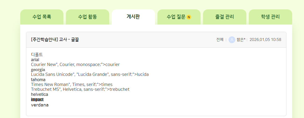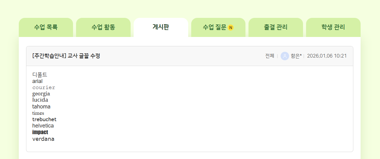 | Steps To Reproduce | 1. 교사 로그인 2. 나의 수업 > 게시판 > 에디터 내 폰트 등록 -Courier New -Lucida Sans Unicod -Times New Roman -Trebuchet MS | ||||