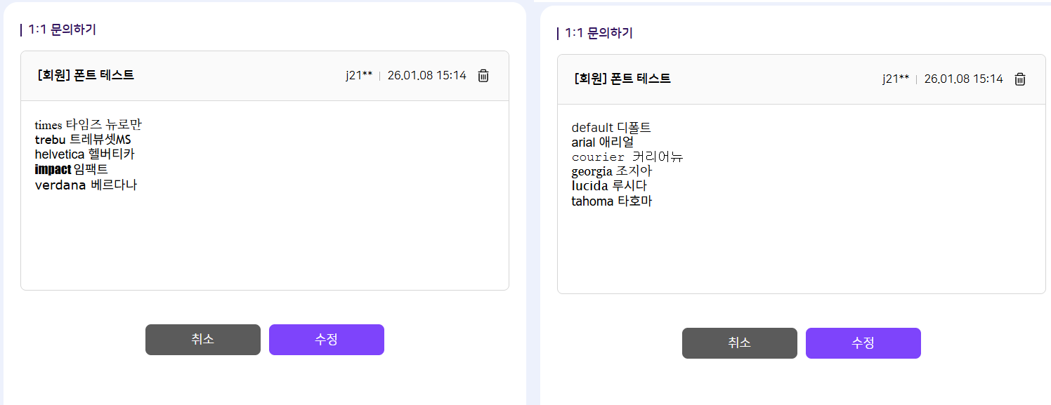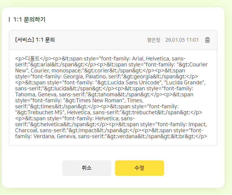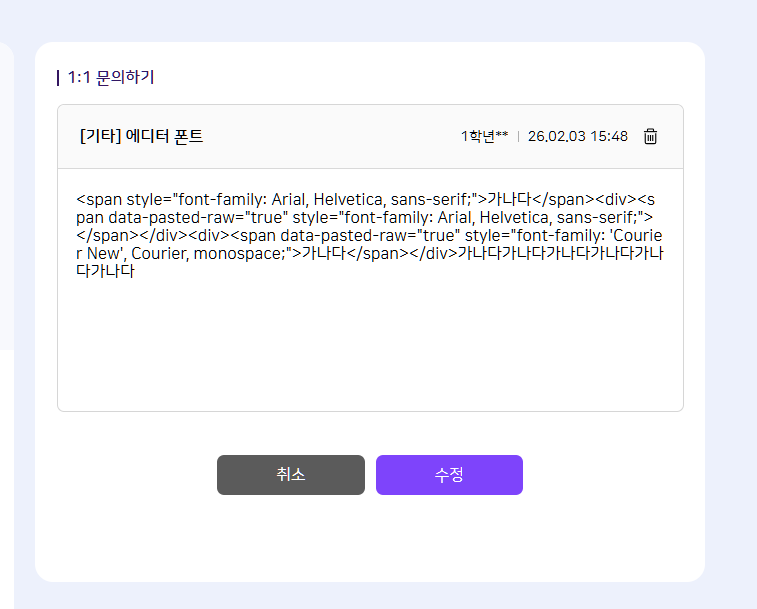 | Description | [에디터][FO] 교사/학생/학부모 : 1:1 문의에서 에디터 내 모든 글꼴로 등록 시 태그 노출되는 현상 | ||||