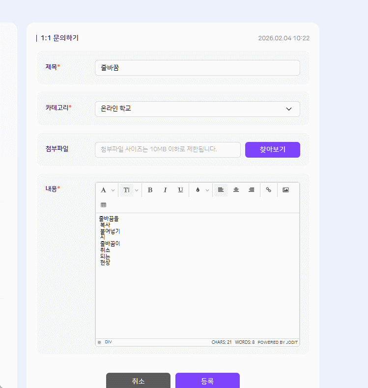 | Summary | 0001942: [에디터][FO] 교사/학생/학부모 : 1:1 문의에서 에디터 내 모든 글꼴로 등록 시 태그 노출되는 현상 | ||||