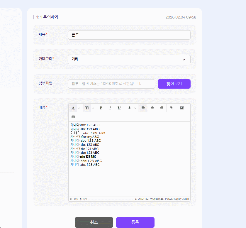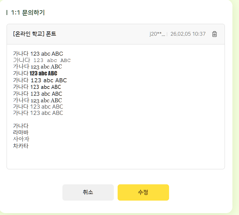 | Steps To Reproduce | 1. 교사/학생/학부모 로그인 2. 1:1 문의 > 에디터 내 모든 글꼴로 등록 -모든 글꼴 | ||||