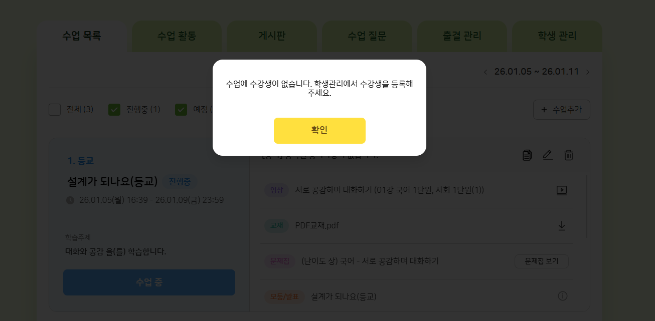 **리허설 수업 생성 후 학생 관리에서 학생을 등록해도 "수업에 수강생이 없습니다. 학생관리에서 수강생을 등록해주세요." 팝업 노출