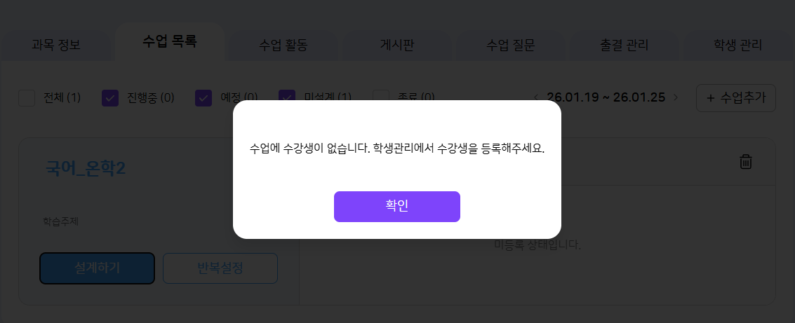 | 2026-01-05 09:01 | 육현웅 | Summary | [디폴트][FO] 온라인 학교에 학생 없어도 수업이 생성되는 현상 => [리허설][FO] 온라인 학교에 학생 없어도 수업이 생성되는 현상 |