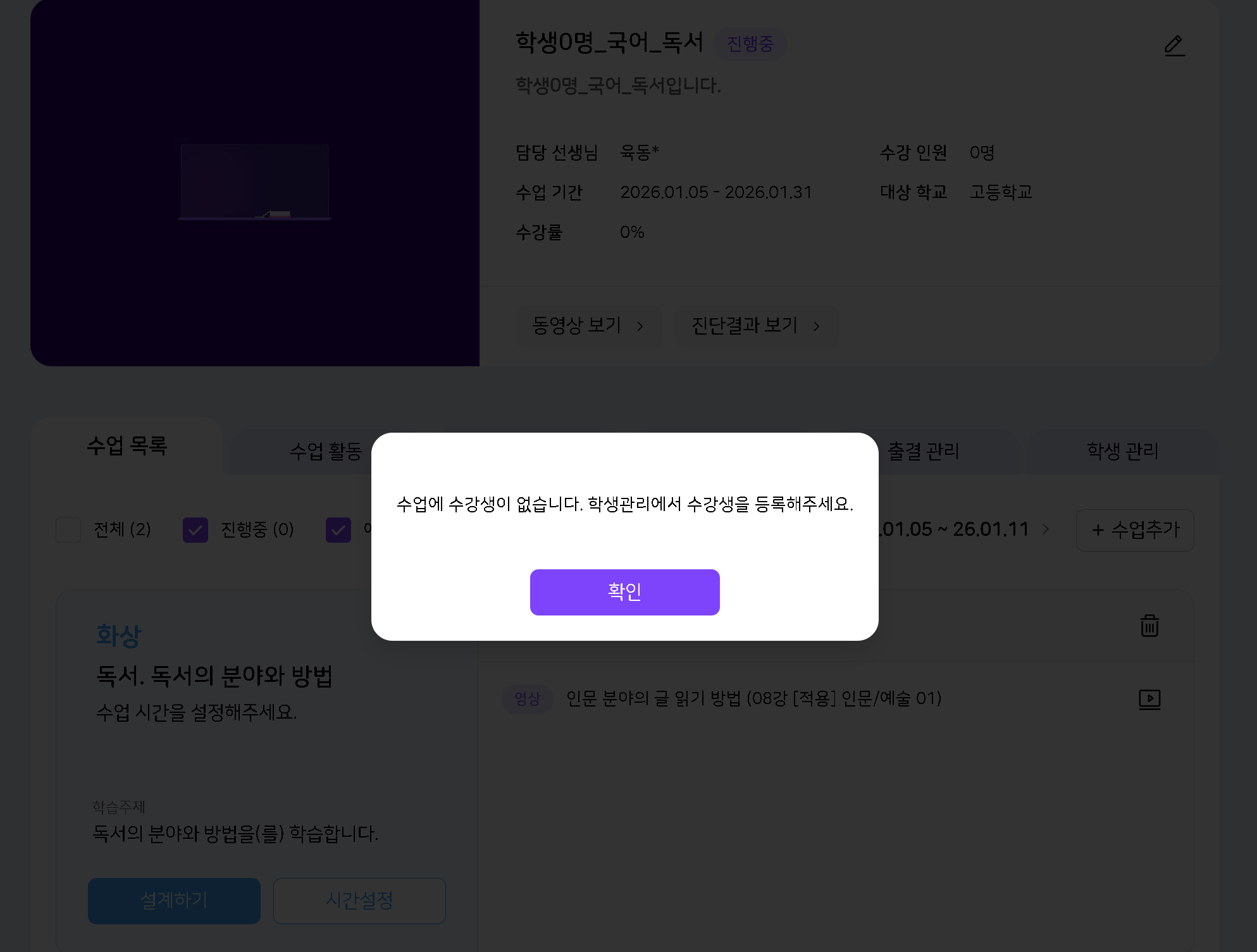 | Steps To Reproduce | 1. 기존 과목에서 새로 생성한 '학생 0명'인 과목에 수업 복사하기 2. '학생 0명'과목에서 복사 받은 수업 설계 시도 3. 수강생이 없어 설계 불가하다는 팝업 응시 | ||||