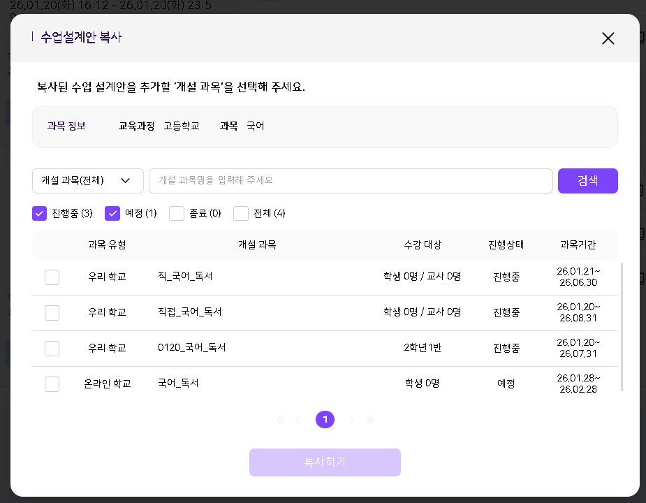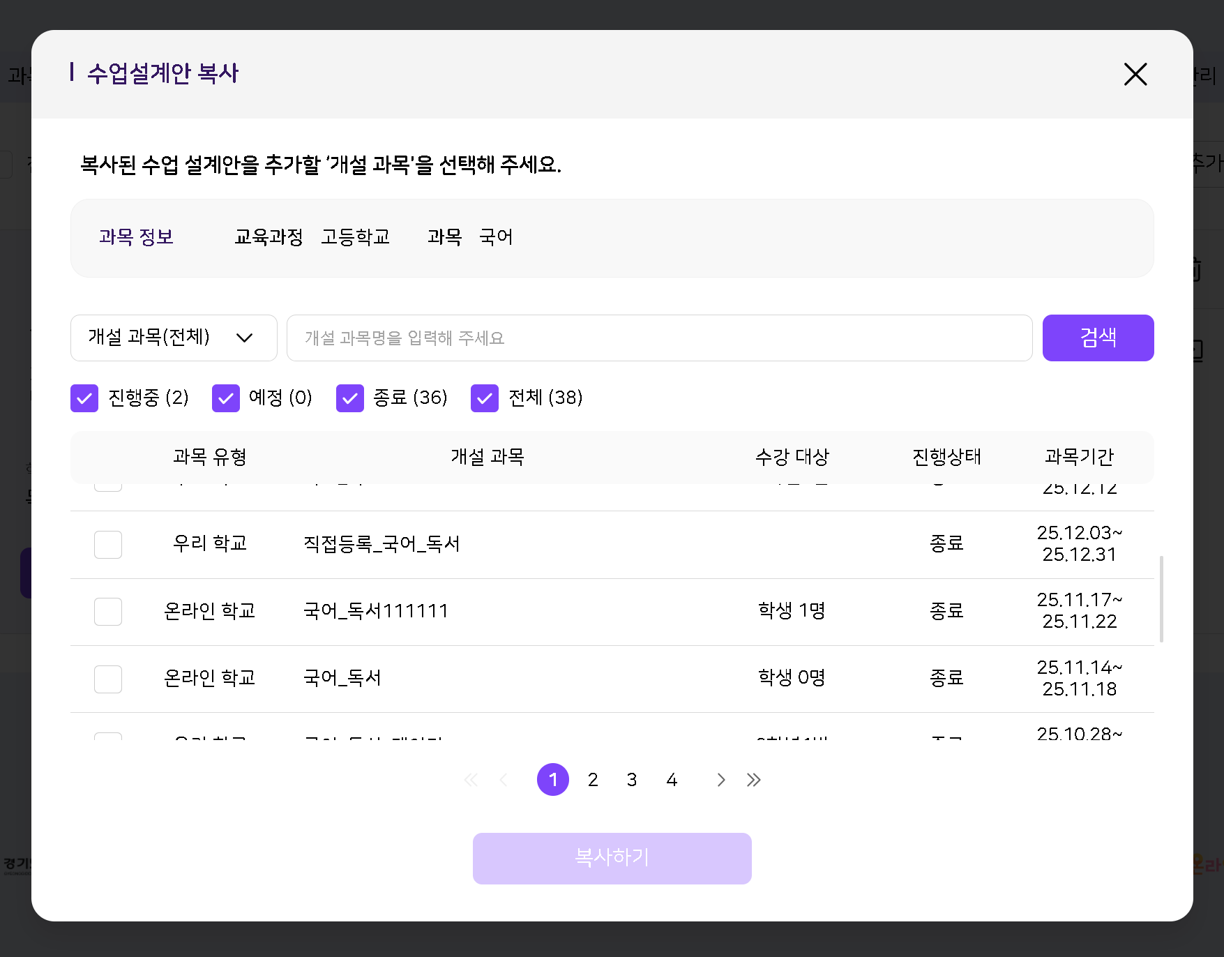 Steps To Reproduce기존 과목에서 수업 복사 클릭 > 온라인 학교/직접 등록 과목 응시