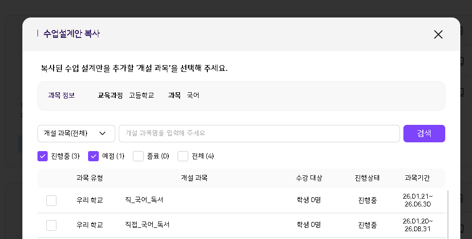 2026-01-06 02:52 이세희 Summary 수업 복사하기 팝업 - 학생 0명일때 온라인 학교는 0명 표기, 직접 등록 과목은 빈공간으로 노출되는 현상 => 수업 복사하기 팝업 - 학생 0명일때 직접 등록 과목은 빈공간으로 노출되는 현상