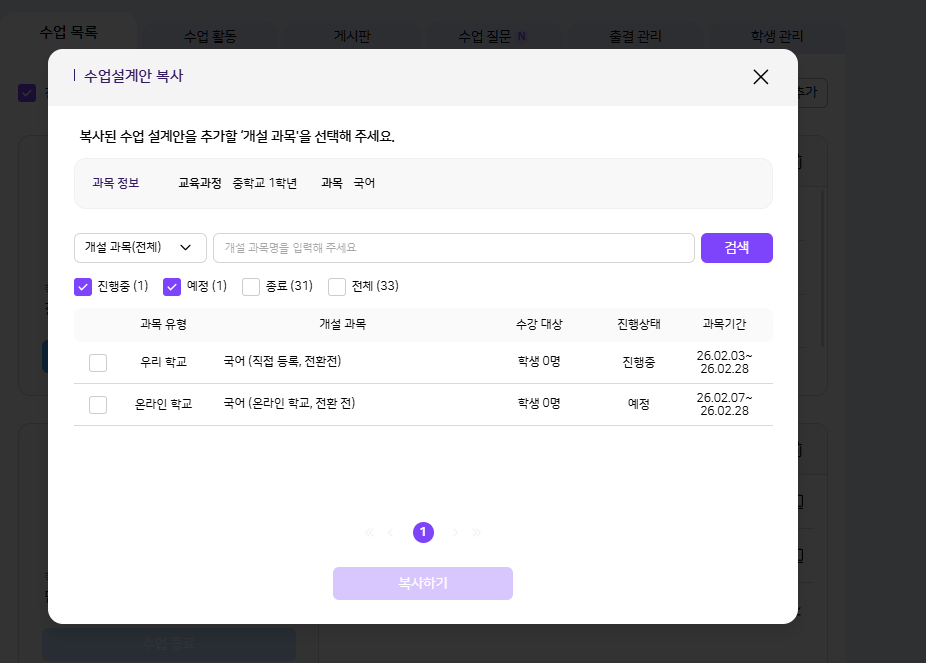 | Steps To Reproduce | 기존 과목에서 수업 복사 클릭 > 온라인 학교/직접 등록 과목 응시 | ||||