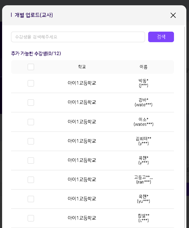 | Summary | 0001948: [마스킹] 교사 : 직접등록 학급/지정학급 > 학생 관리 > 교사 탭 > 교사 개별업로드 팝업 > 교사명 | ||||