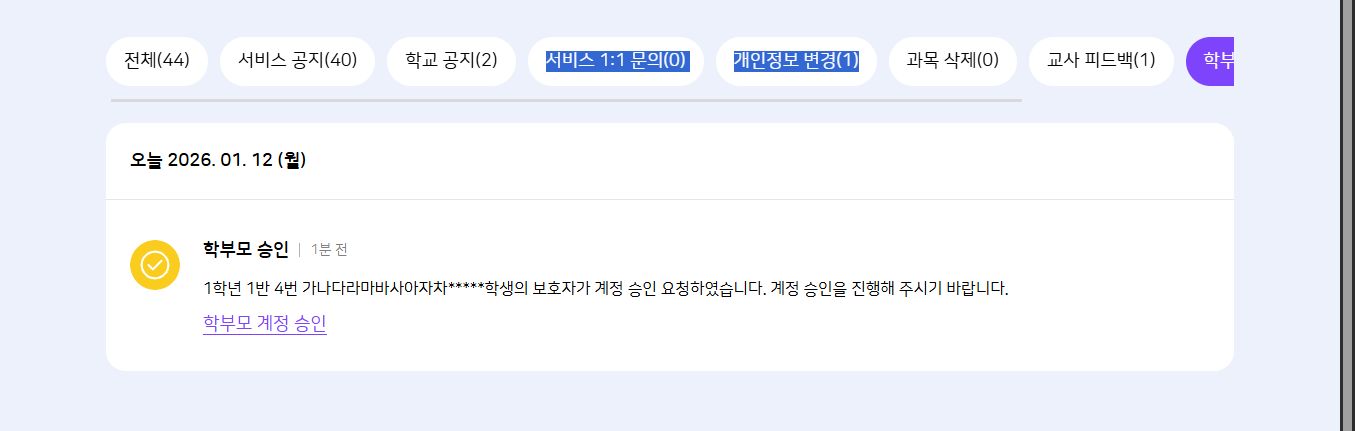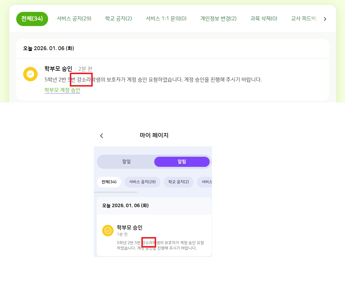 | Description | [마스킹][PC/모바일] 학생 : 학부모가 회원가입 신청 시 학생의 [알림]에 학생 이름 평문 노출 *상용/TB 공통 이슈 | ||||