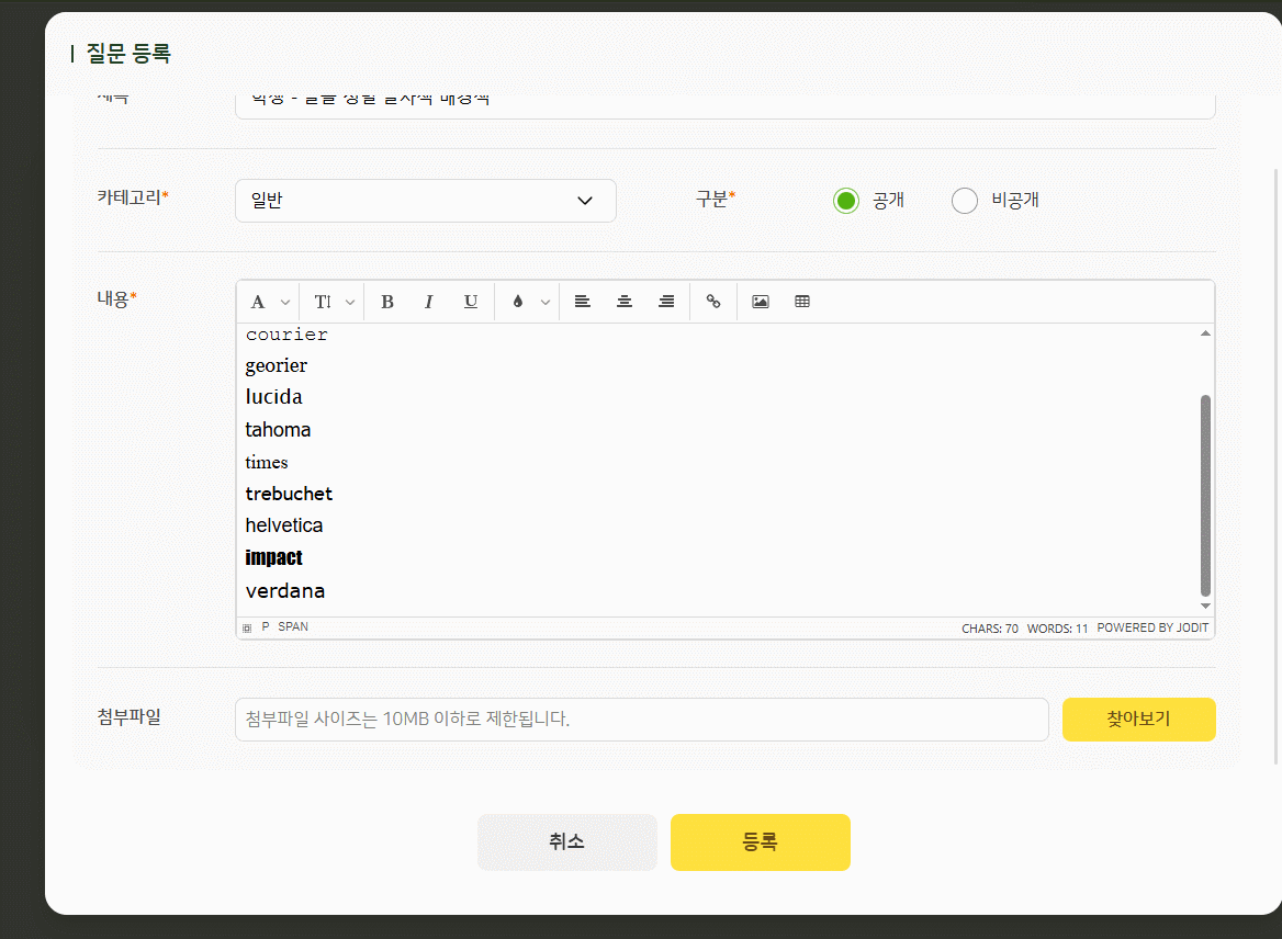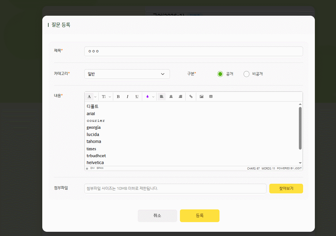 | Summary | 0001967: [에디터][FO] 학생 : 나의 수업 > 수업 질문에서 에디터 : 글꼴, 정렬(가운데, 오른쪽), 글자색, 배경색 적용 안되는 현상 | ||||