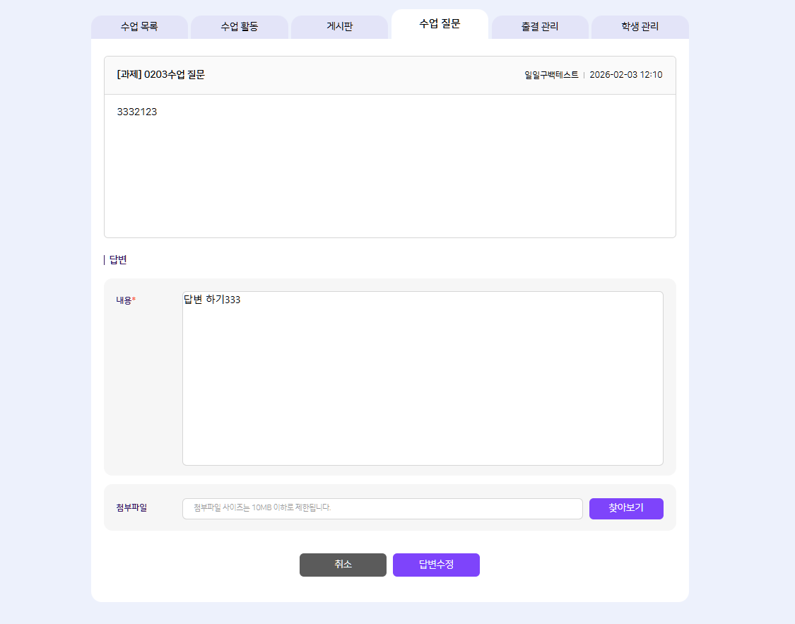 | Summary | 0001971: 학생이 등록한 수업 질문에 교사가 답변 등록 시도시 error발생 | ||||