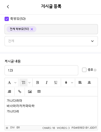| Description | [에디터][모바일]우리반 게시판 - 게시글 등록 시 텍스트 작성 후 줄바꿈시 글자가 겹쳐서 노출되는 현상 저장 후에는 정상 적으로 노출되지만, 작성하는 당시에는 텍스트가 겹처서 보여지는 현상입니다. | ||||
