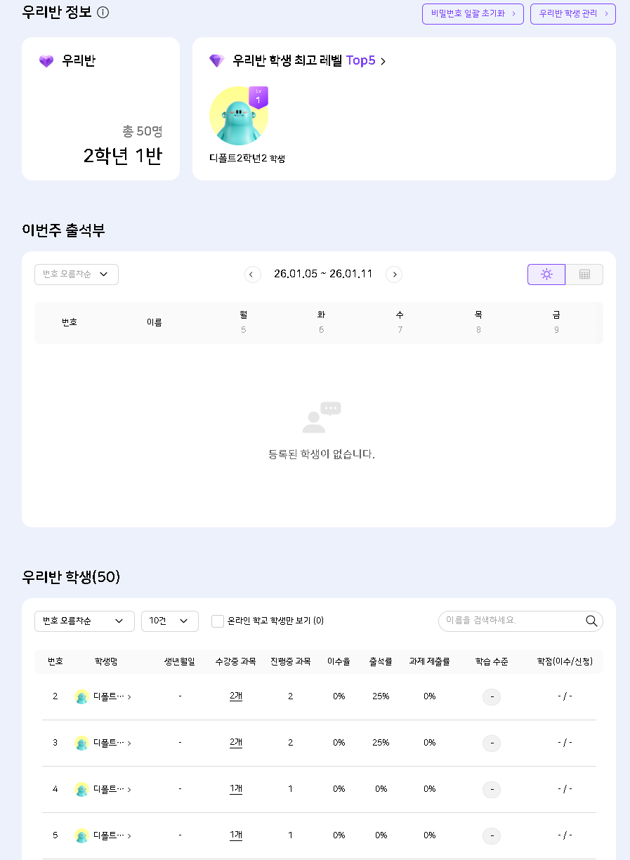 | Description | [디폴트][FO] 나의 교실 - 이번주 출석부에 학생 정보 노출되지 않는 현상 해당 교사 계정에 학생들이 등록되어 있으나 이번주 출석부에 학생 리스트 및 데이터가 노출되지 않는 현상입니다. 초등/중등 계정 모두 재현됨. | ||||
