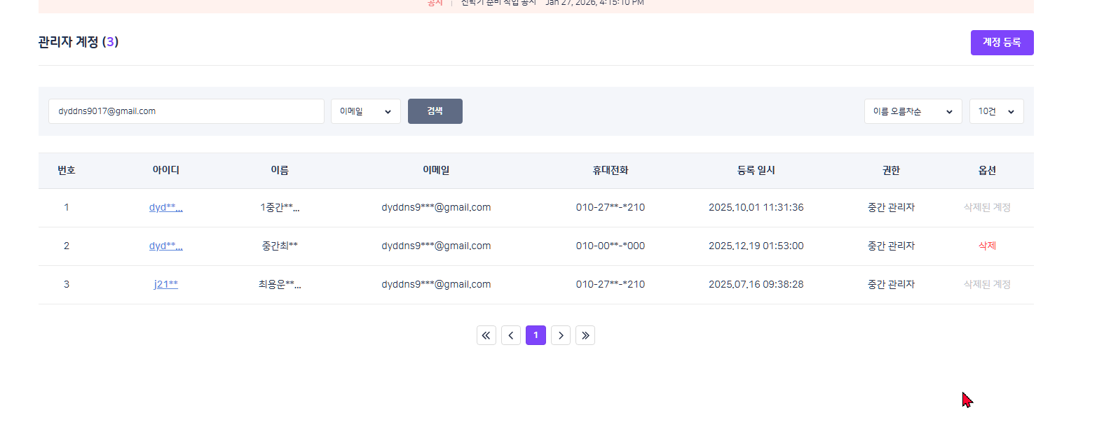 | Steps To Reproduce | 1. 계정 관리 > 관리자 계정 진입 2. 이메일 검색 시도 (부분일치, 전체일치) | ||||