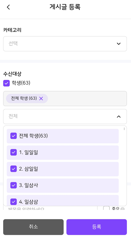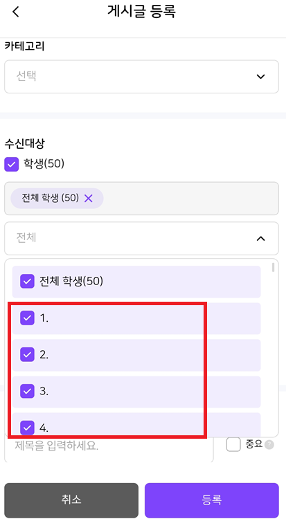 | Steps To Reproduce | 1. 모바일 : 교사 로그인 2. 우리반 게시판 > 등록 > 수신대상 > 학생 | ||||