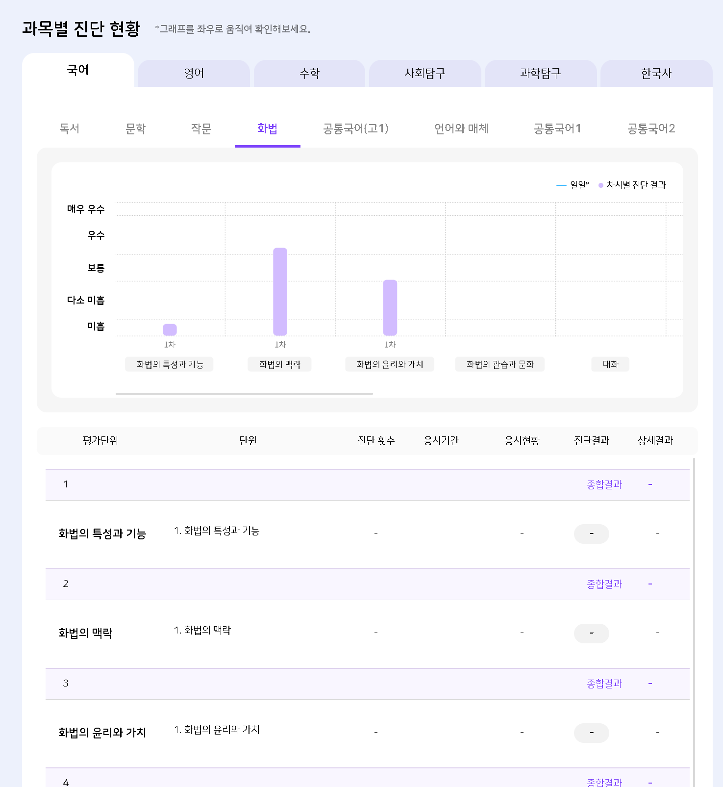 | Steps To Reproduce | 학생 : AI 학습진단 > 국어 독서/ 국어 화법 > 그래프 응시 | ||||