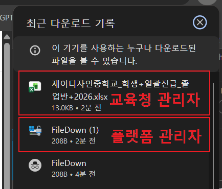 | Steps To Reproduce | 1. 플랫폼관리자 로그인 2. 1:1 문의 첨부파일 다운로드 (xlsx) 3. 교육청관리자 로그인 4. 1:1 문의 첨부파일 다운로드 (xlsx) 5. 파일 비교 | ||||