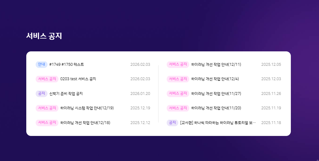 | Steps To Reproduce | 1. PC 하이러닝 메인 2. 하단 공지사항 영역 | ||||