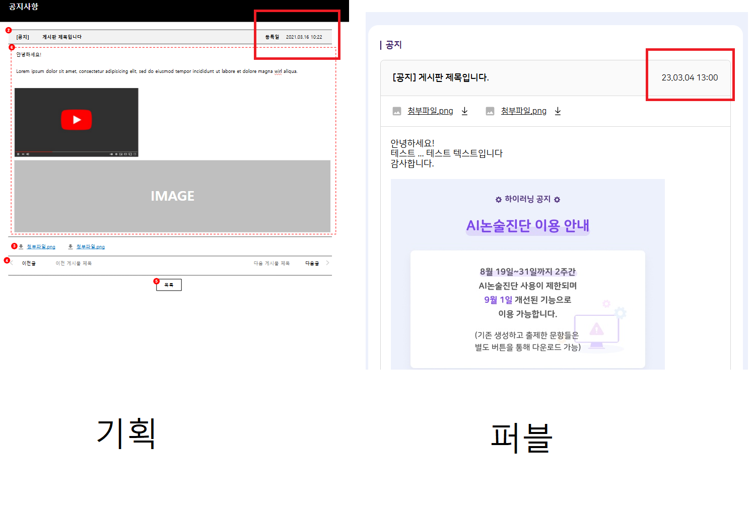 | Description | 공지사항 상세의 등록일 표기에 관한 기획 문의 기획서 : YYYY.MM.DD HH:MM 퍼블 : YY.MM.DD HH:MM 현재 TB는 퍼블에 나와있는 형식으로 노출되어 있는 상태입니다 | ||||